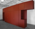 Der 9m lange Raum-Schrank im Eingangsflur ist zentraler Organisator und Stauraum der Wohnung: Unter den Ober-schränken betritt man - flankiert von 2 Schubladensideboards - Bad und Küche, in den Hochschränken befinden sich Garderobe, Besenkammer und Schuhschrank sowie die Tapetentür zum kleinen, mit Filmbeschichteten Multiplex-platten ausgeschlagenen WC-Kabinett. Die Farbigkeit des Linolbodens werden im Samtvorhang und der matten Lackierung aufgegriffen.